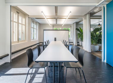 Anlaufstelle für Besucher ist die Empfangsanlage in rotem Linolbelag. Beim grossen Besprechungsbereich wurde das Tischsystem K1 eingesetzt, ebenfalls mit einer Linoloberfläche. Ein befahrbarer Schrank mit Schubladeneinteilungen dient für die Unterbringung der Geräte und Utensilien.