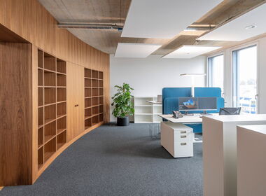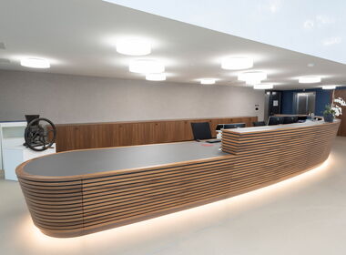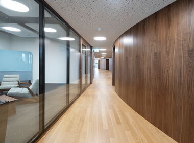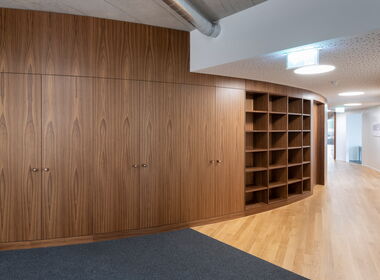 Die Wahl der richtigen Partner war bei dieser grossen Anzahl von Mitgliederbetrieben eine besondere Herausforderung für die Verbandsleitung. Das Ergebnis kann sich in jeder Hinsicht sehen lassen. Geschweifte Gangzonen in einer Glas-Nussbaum-Kombination mit eingebauten Regalen zeigen die hohe Design- und Verarbeitungskompetenz der Schreinerbranche.