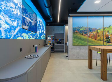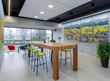 Im Obergeschoss befindet sich ein Mehrzweckraum für Besprechung, Begegnung und Arbeiten. Zentrales Element dabei ist der 4 Meter lange Stehtisch in gebürstetem Eiche Altholz mit integrierter Medienanbindung. Stirnseitig an der Wand ist eine Cafeteria-zeile angeordnet. Darüber ist ein Leuchtbild mit Bildschirm für Präsentation angebracht. Seitlich vom Tisch sorgen Akustikbilder für eine angenehme Raumatmosphäre.