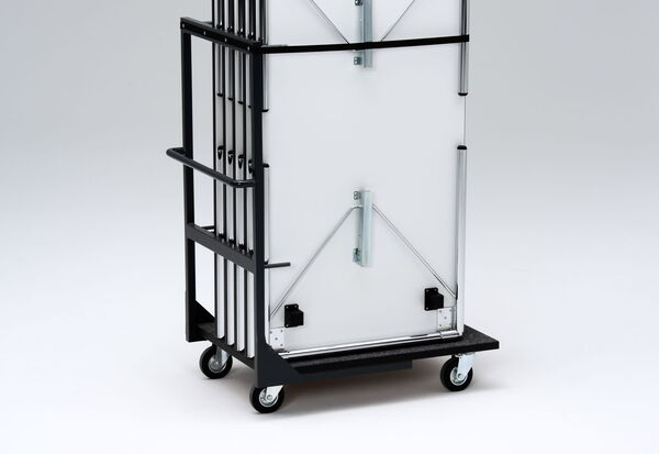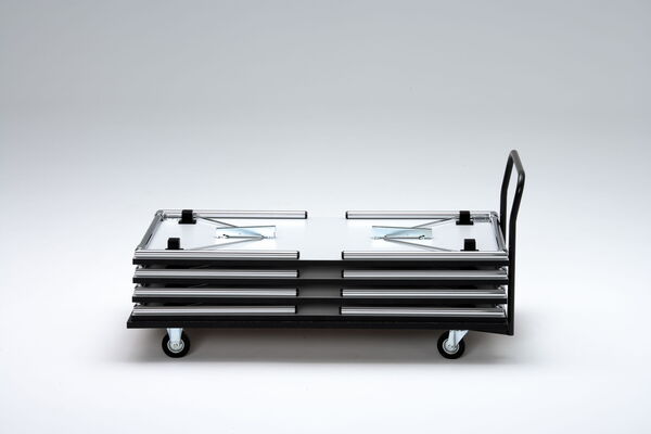 Für den liegenden Transport von Klapptischen. Ideal bei genügend Platz, um Klapptische schnell und kompakt zu versorgen – zum Beispiel in Turnhallen und Mehrzweckräumen. Die Wagenplatte ist mit Textilbelag und umlaufender Kante in schlagfestem ABS ausgerüstet.
