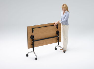 Der Klapptisch KLT-40 mit der seitlich klappbaren Tischplatte und dem Untergestell auf Rollen wird überall dort eingesetzt, wo Räume flexibel genutzt werden. In kürzester Zeit ist er bereit für das Meeting – und ebenso schnell wieder Platz sparend versorgt.