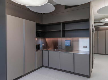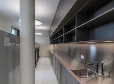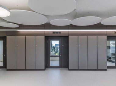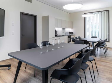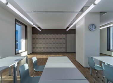 Nach erfolgreicher Fertigstellung der ersten Bauetappe folgte eine zweite Etappe mit dem Bildungszentrum für Gesundheit und Soziales in Weinfelden als Mieter. Das Bildungszentrum bietet sowohl Grund- als auch Weiterbildungsmöglichkeiten im medizinischen Bereich. Hier lag der Fokus auf der Ausstattung von Schulungsräumen, für die wir Lockerschränke, Einbauschränke als Raumtrenner, Rahmentüren und eine Einbauküche lieferten.