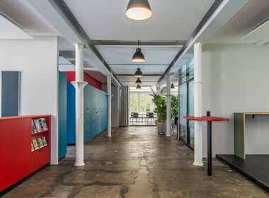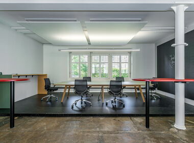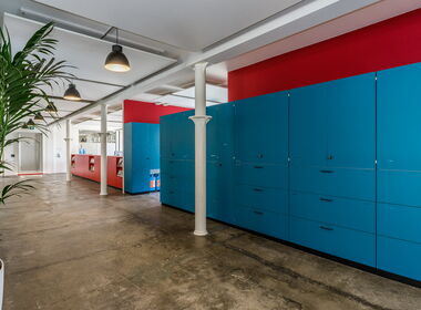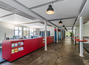 Anlaufstelle für Besucher ist die Empfangsanlage in rotem Linolbelag. Beim grossen Besprechungsbereich wurde das Tischsystem K1 eingesetzt, ebenfalls mit einer Linoloberfläche. Ein befahrbarer Schrank mit Schubladeneinteilungen dient für die Unterbringung der Geräte und Utensilien.