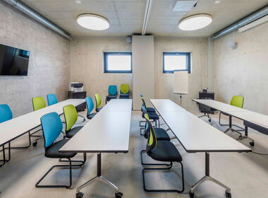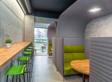 Im Obergeschoss befindet sich ein Mehrzweckraum für Besprechung, Begegnung und Arbeiten. Zentrales Element dabei ist der 4 Meter lange Stehtisch in gebürstetem Eiche Altholz mit integrierter Medienanbindung. Stirnseitig an der Wand ist eine Cafeteria-zeile angeordnet. Darüber ist ein Leuchtbild mit Bildschirm für Präsentation angebracht. Seitlich vom Tisch sorgen Akustikbilder für eine angenehme Raumatmosphäre.