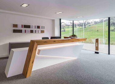Eine Empfangstheke von Zurbuchen ist die Visitenkarte eines erfolgreichen Unternehmens. Die Empfangsanlage als Schaltzentrale der Kommunikation schneidern wir nach Mass auf Ihr Unternehmen zu: Wir planen und realisieren Ihre Empfangstheke in genau den Materialien, die zu Ihrer Corporate Identity passen, und wählen eine Formensprache, die sich durch Grosszügigkeit und Stil auszeichnet.