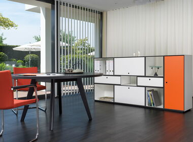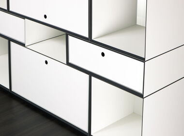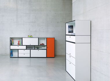 Tamos M5 ist das flexible Regalsystem für den Arbeitsalltag und für zu Hause. Durch die vielseitigen Ausrüstungsmöglichkeiten passt sich das System ständig Ihren Bedürfnissen an. Front- und Rückkante, sowie die Korpusecken sind auf Gehrung gearbeitet und wirken dadurch noch filigraner.